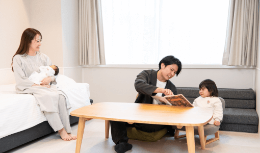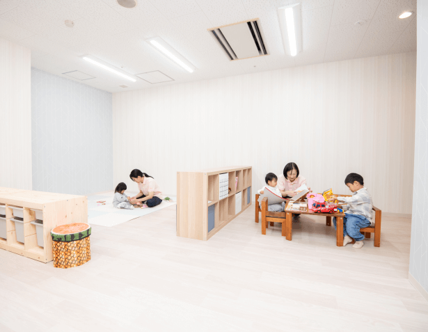 お母さんのリフレッシュ目的にも利用できる「一時保育室」は、生後1ヶ月から利用できます。「産後ケア宿泊」では、寝不足で心身ともに疲労しているお母さんに安らぎを提供します。お母さん同士で楽しむ「おやこプログラム」も人気です。