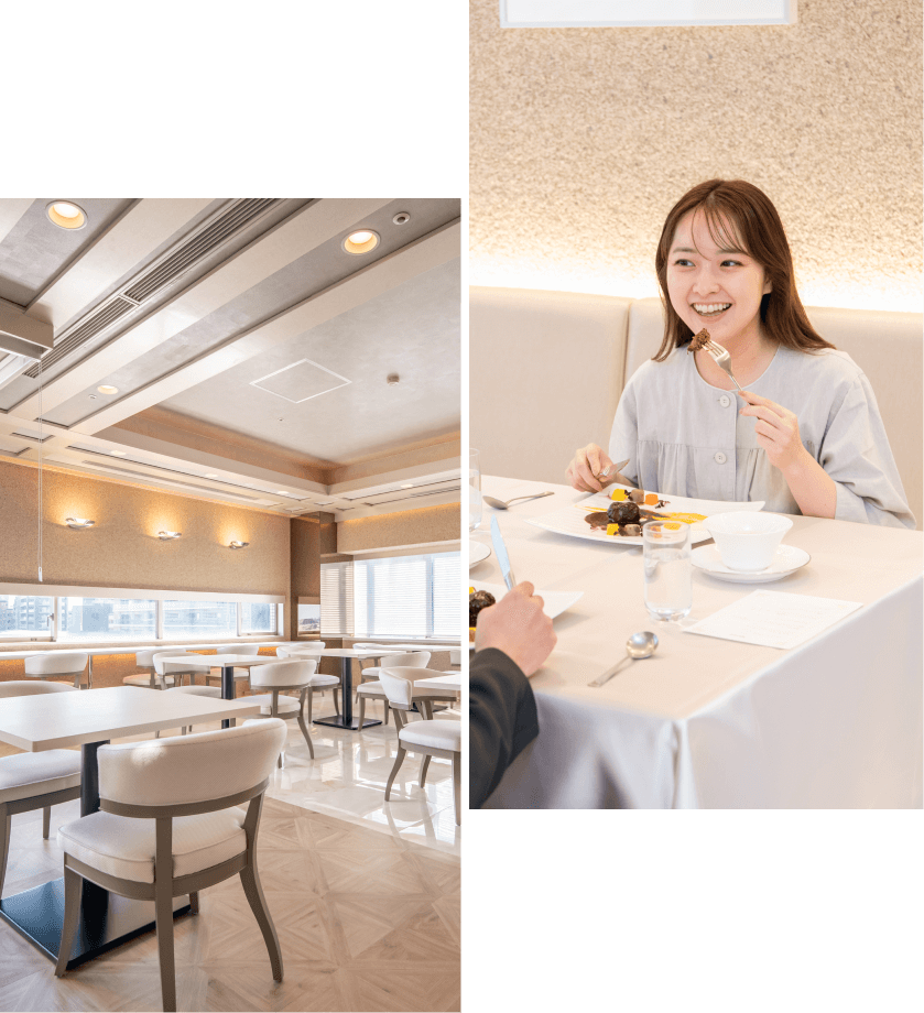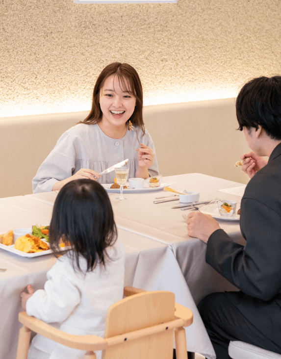 入院中は、お母様の体調に合わせて、母児同室または新生児室での赤ちゃんのお預かりをお選びいただけます。当院自慢の専属シェフが手掛け、管理栄養士監修のお食事とティータイムはご好評をいただいており、家族みんなでお祝いディナーを囲むひとときをお楽しみいただけます。また、産後のエステも大変人気です。