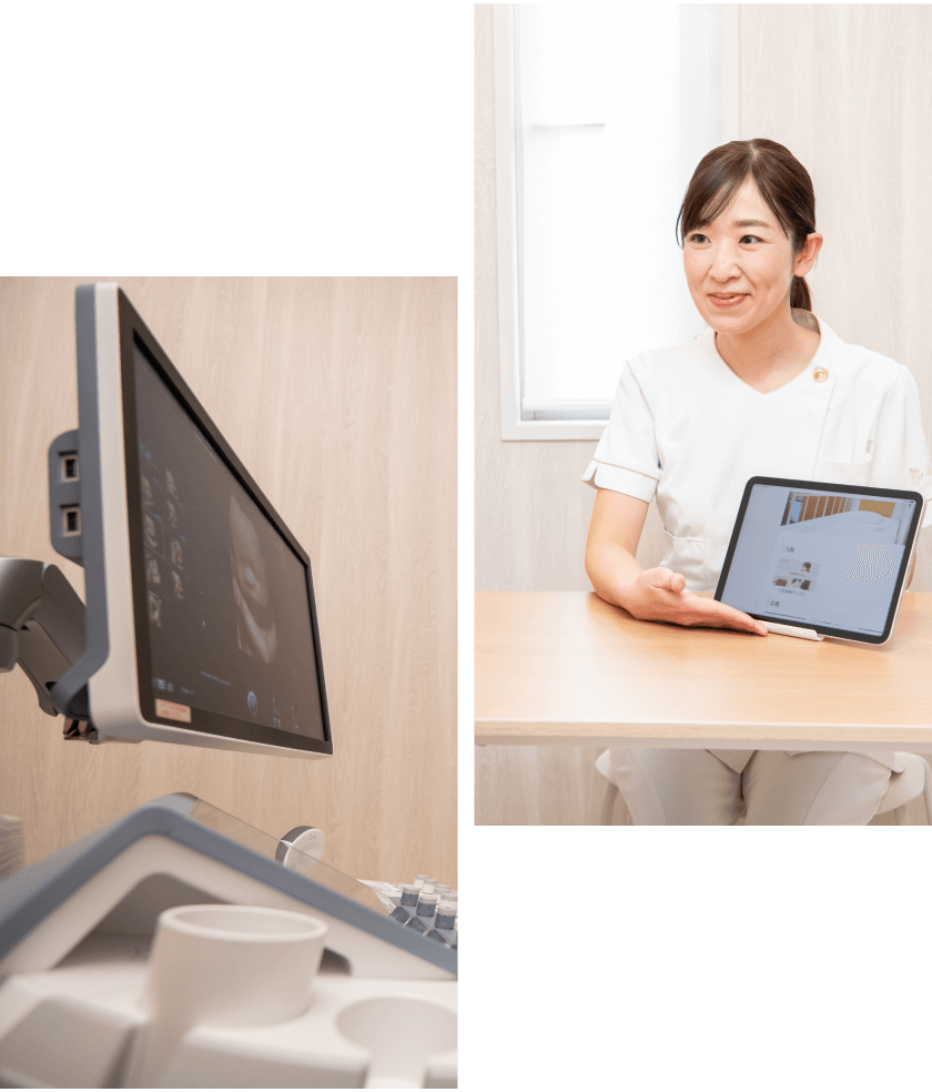 妊婦健診は、お母さんと赤ちゃんの健康を守り、安全な出産を迎えるために欠かせない大切な検査です。健診では、赤ちゃんの成長や発育状態、お母さんの体調を定期的に確認し、自覚症状がなくても潜んでいるトラブルを早期に発見します。大学病院など高度周産期医療施設とも連携していて、緊急時には24時間体制で診察を行っていますので、困ったことがあればいつでもご連絡ください。一般的な妊婦健診に加えて、赤ちゃんの表情や動きをよりリアルに確認できる4Dエコー検査にも対応しています。赤ちゃんの様子をより詳しく知りたい方や、ご家族と一緒にその瞬間を共有したい方におすすめです。