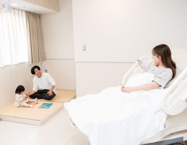 出産方法は、自然分娩・無痛分娩・計画分娩・帝王切開など、多様な選択肢をご用意しています。また、出産入院時には一時保育室で上のお子さまをお預かりしたり、帝王切開時の夫の立ち会いが可能など、ご家族に寄り添うサポートを大切にしています。さらに、分娩室エリアにはお子さまが遊びながら待てる「キッズルーム」も完備し、家族全員が安心して過ごせる環境を整えています。
