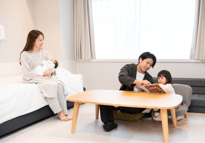 出産時にご利用いただく「個室」は、全室にシャワー・トイレを完備し、無重力睡眠を叶えるテンピュール製電動リクライニングベッド(Zero-G®ベッド)を採用しております。リニューアル個室は「ReFaルーム」仕様で、シャワーヘッドやドライヤーを備えたホテルライクなシャワールーム、Netflix視聴が可能な薄型テレビなど、快適な環境をご提供します。さらに、小上がり個室では、ご主人様や上のお子様もご宿泊いただけるため、家族全員で安心してお過ごしいただけます。