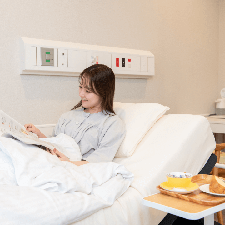 当院では、出産後の入院期間を快適にお過ごしいただけるよう、さまざまなサポートと充実した設備を整えています。お食事は、栄養バランスを考えた美味しくて彩り豊かなメニューをご用意しております。お部屋はプライバシーを重視した快適な個室やご家族も宿泊できるファミリールームをご用意し、ご家族とともにゆっくり過ごせる空間を提供しています。